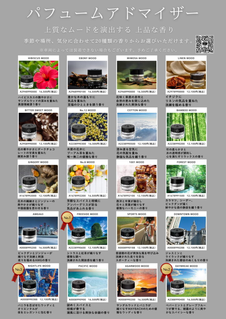 メルセデスのパフュームアトマイザーは20種類の豊富なラインアップがあり、上質な雰囲気を演出します🌲